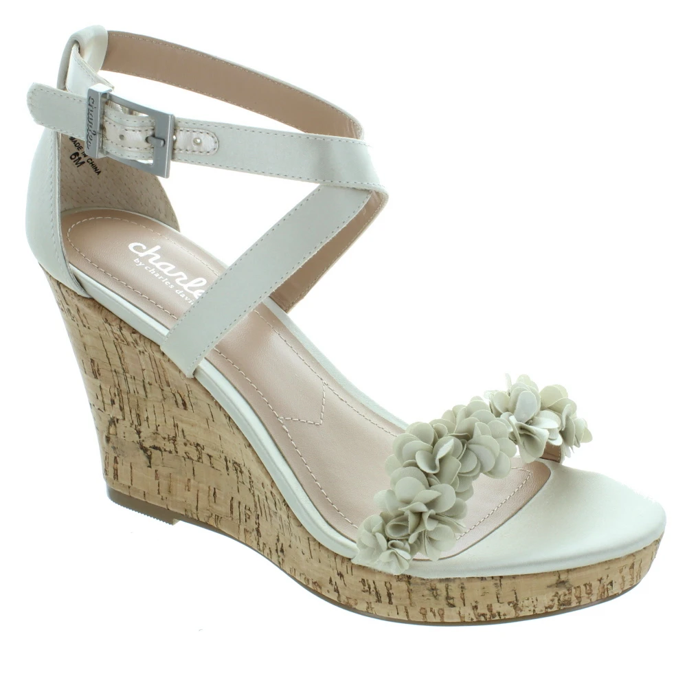 The satin-chiffon fabric uppers have a slight sheen that dresses up these super feminine wedges with the 3D floral strap and cork wedge. The approximately 4 inch wedge heels will definitely lift you up and make your legs look fantastic.