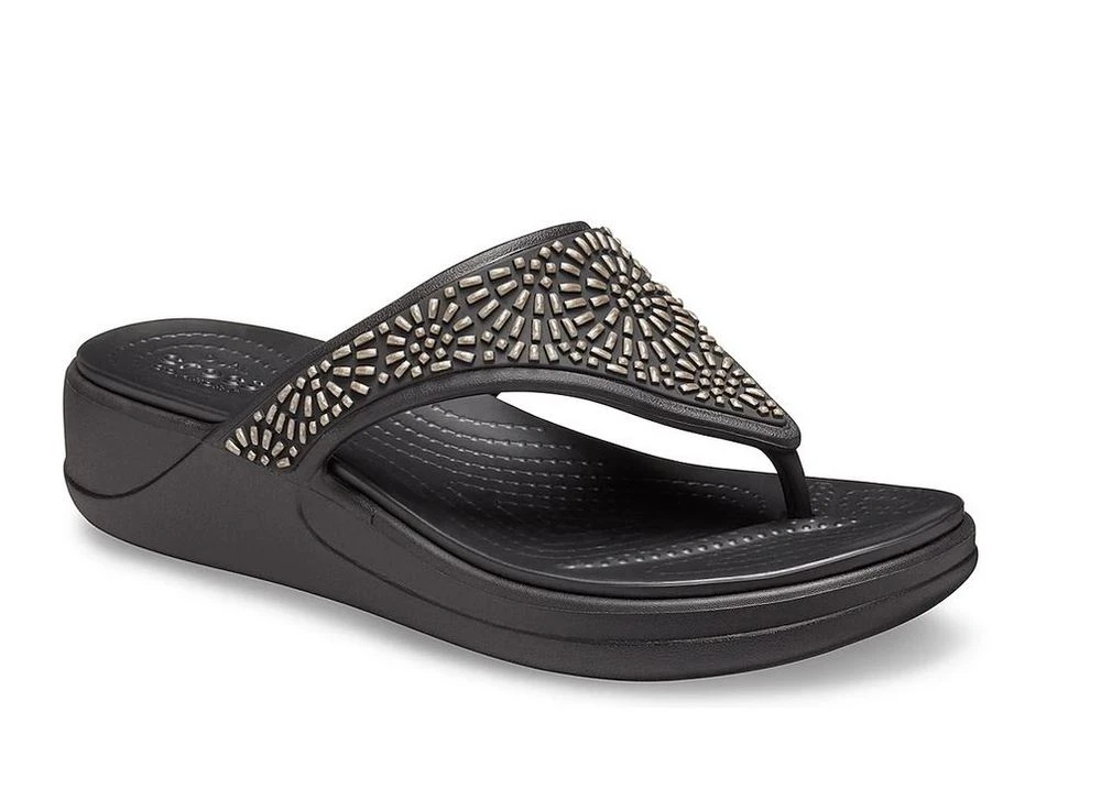 Slip into the Crocs Monterey sandal for a comfortable, yet stylish look. The embellished upper gives this sandal a dressy look, allowing it to be styled any way you want. Croslite upper / Croslite foam footbed. Slip-on, round open toe and a 2` heel.