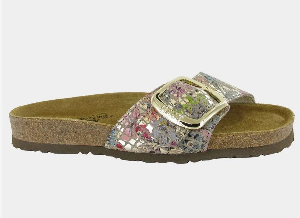 A stylish slide sandal for any day activities. Features a cork and latex footbed and suede mold that fits to the shape of your foot. Heel height 1.25 inches and fits true to size. (half sizes size up)