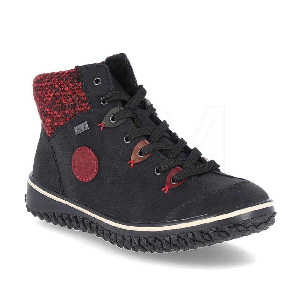 This Rieker boot is a cozy fall and winter option for those who like a sneaker look with the warmth of a boot. Details include a maroon knitted cuff, soft padded cuffs, a cuddly fleece lining, a water-repellent Rieker Tex membrane, and a thick rubber outsole.