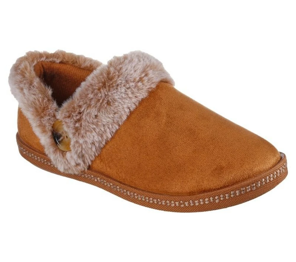 Lay back and enjoy all-day comfort in these cozy indoor-outdoor slippers. Features a soft woven fabric upper and faux-fur lining with a side button. Cushioned memory foam footbed and flexible traction outsole. 1/2-inch heel.