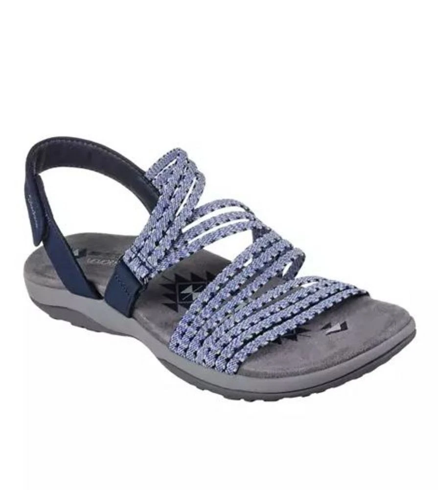 A go-to sandal for this season. This sporty sandal features a strappy design and faux leather upper with geo print accents. A memory foam footbed will keep your feet comfy all day long. 1 inch heel height and back elastic waistband.