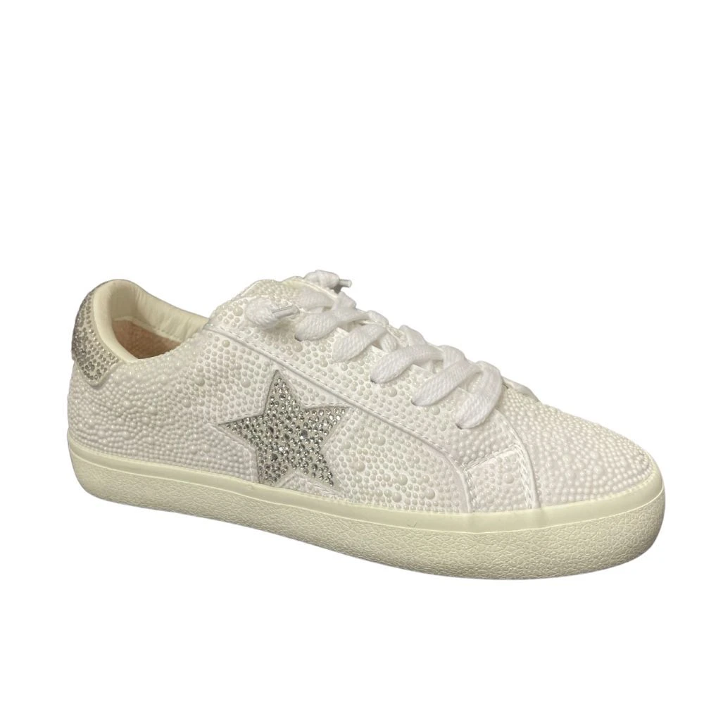 Perline features a rounded-toe and fun dot upper. Easy no-tie laces and a quick slip on and off design. Star detail on the side adds fun detail and gorgeous rhinestone embellishments finish off this shoe. Distressed rubber outsole, footbed and manmade lining.
